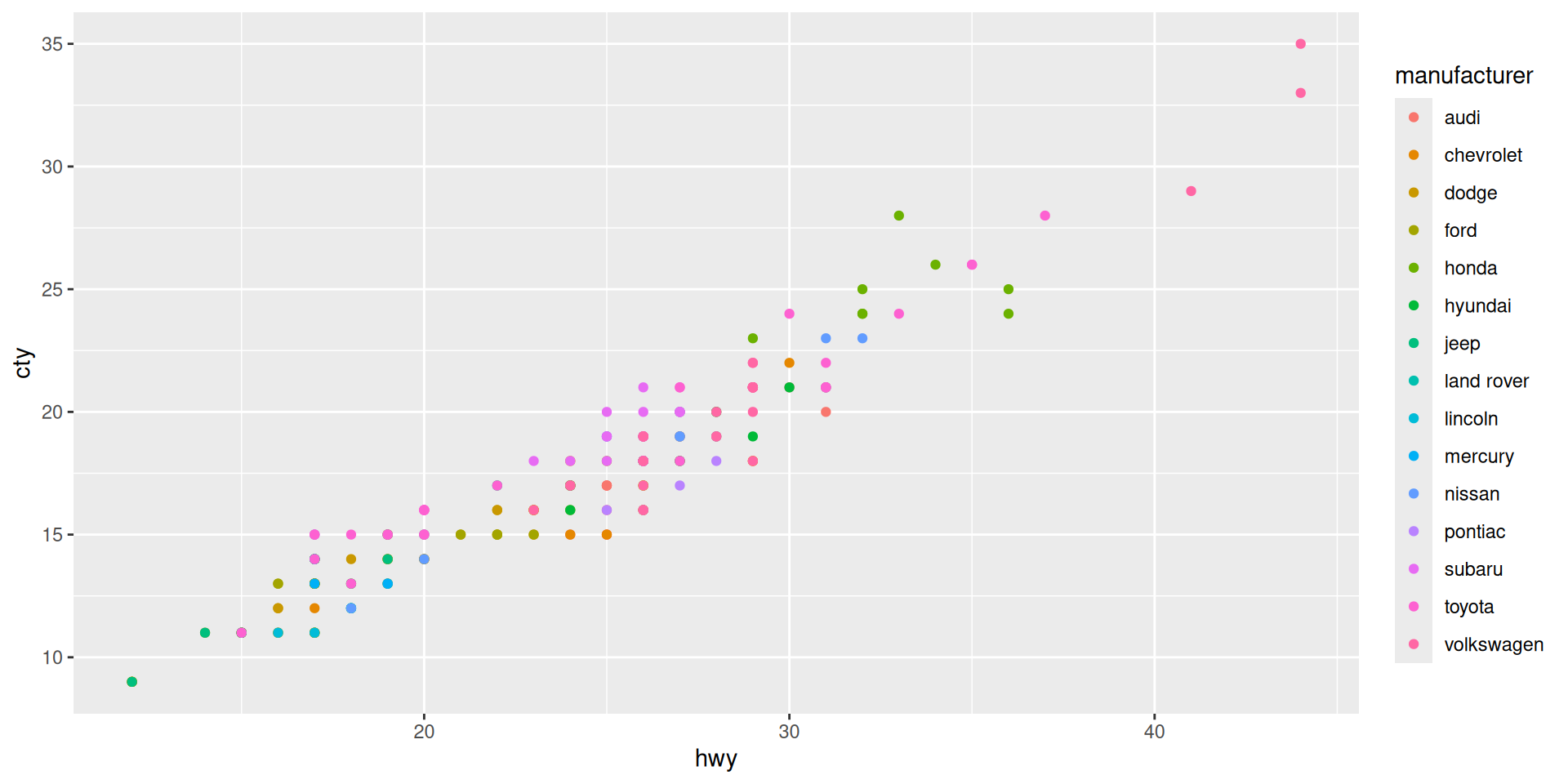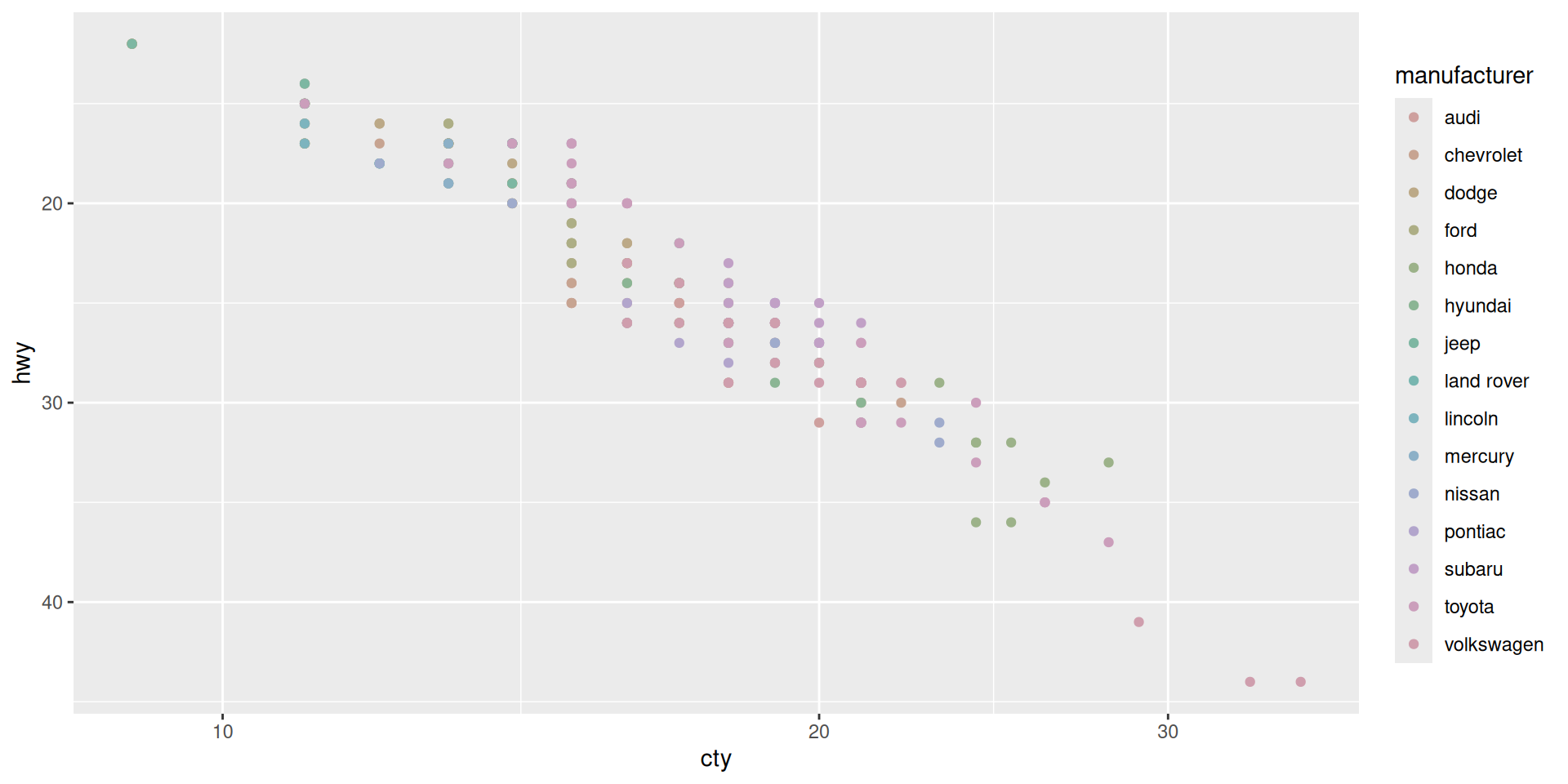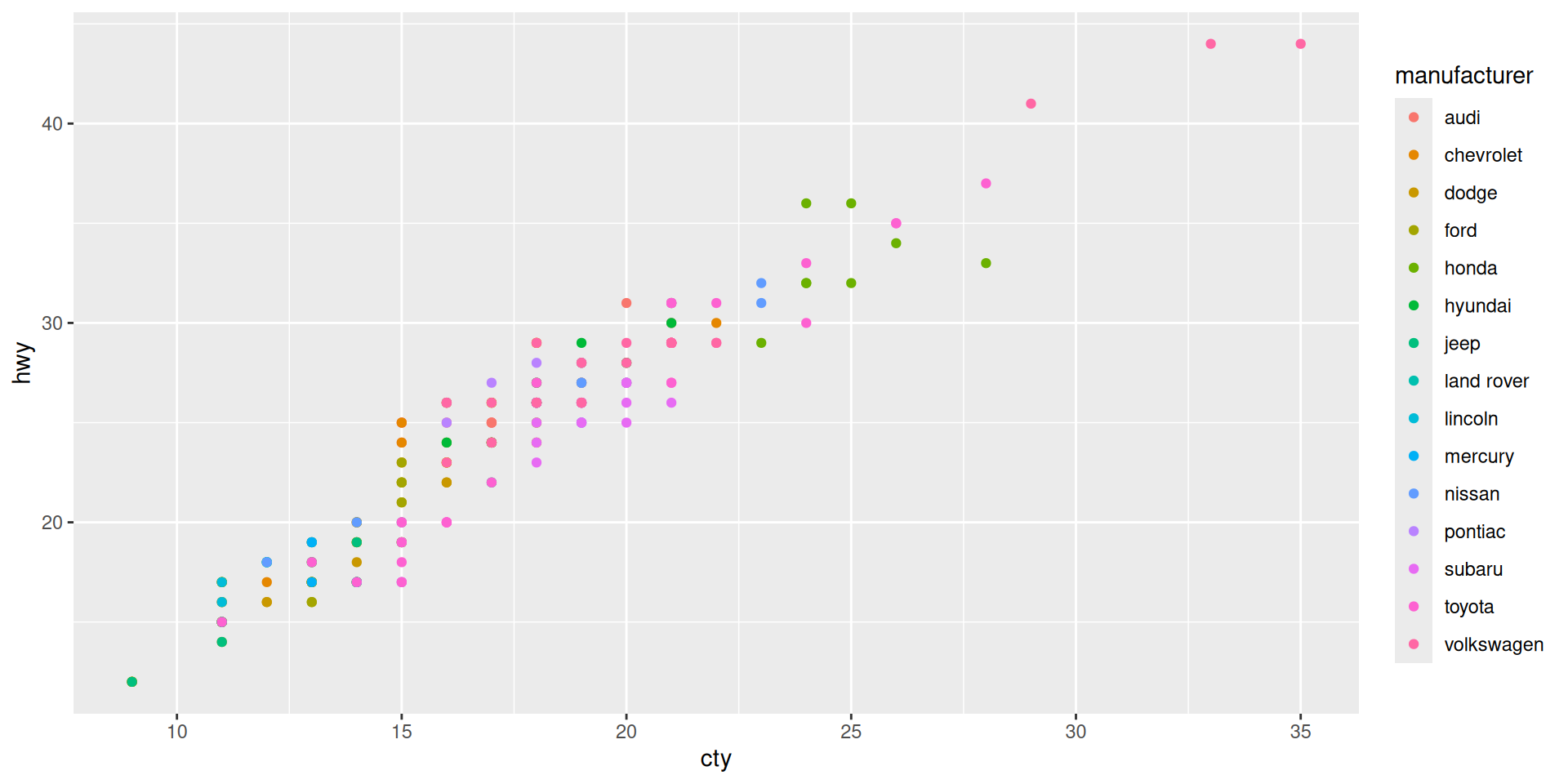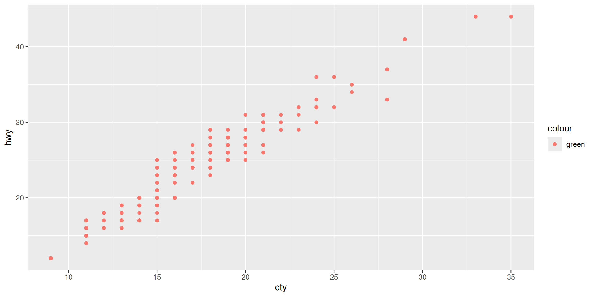 ggplot(mapping = aes(x = cty, y = hwy)) + geom_point(mpg)