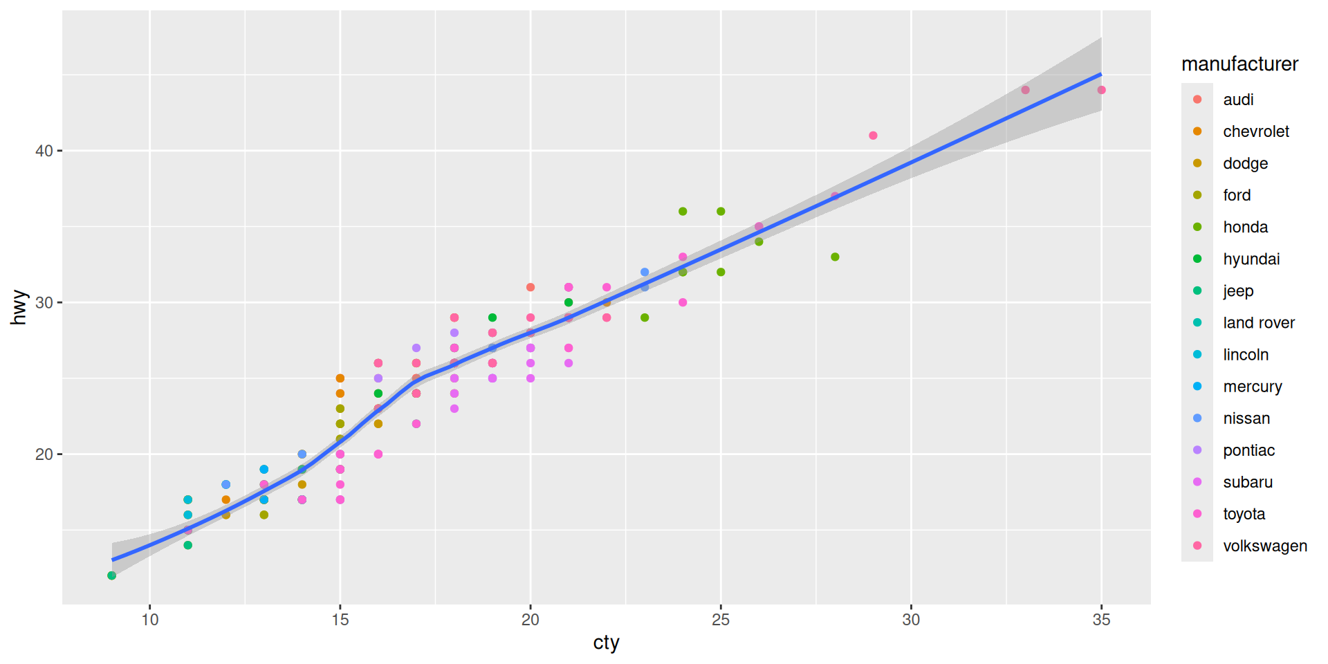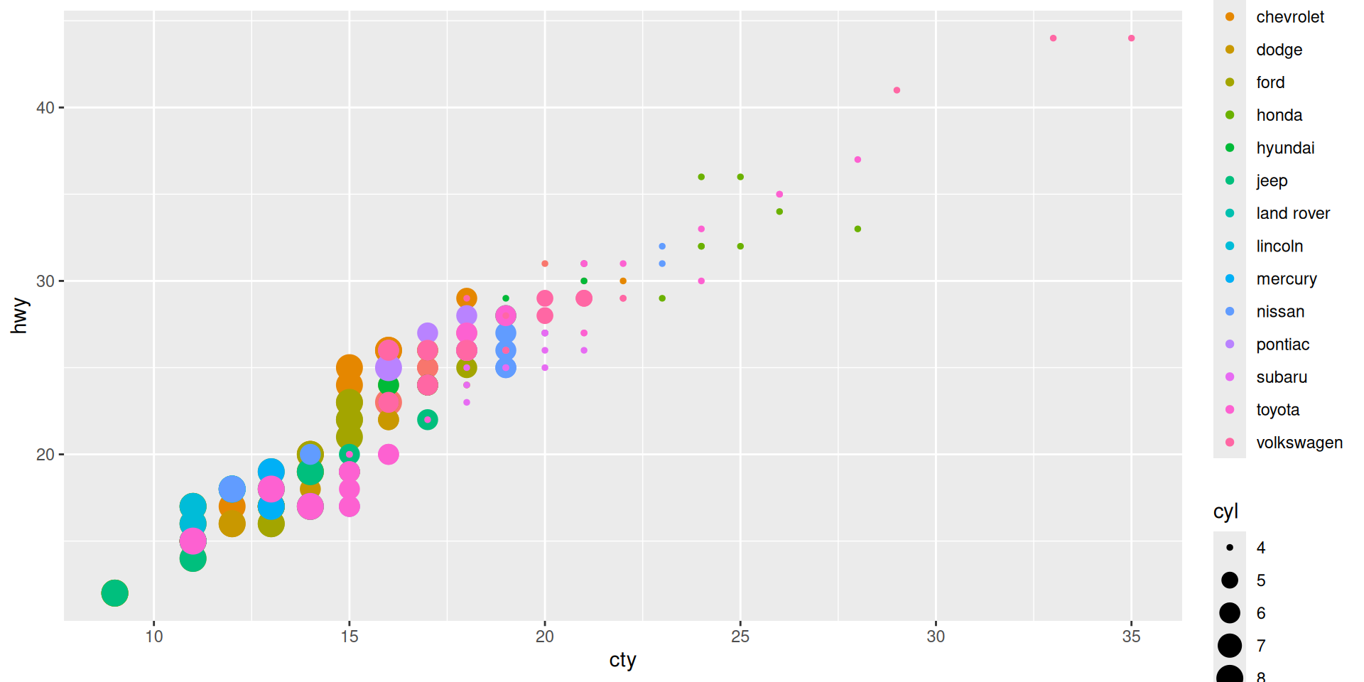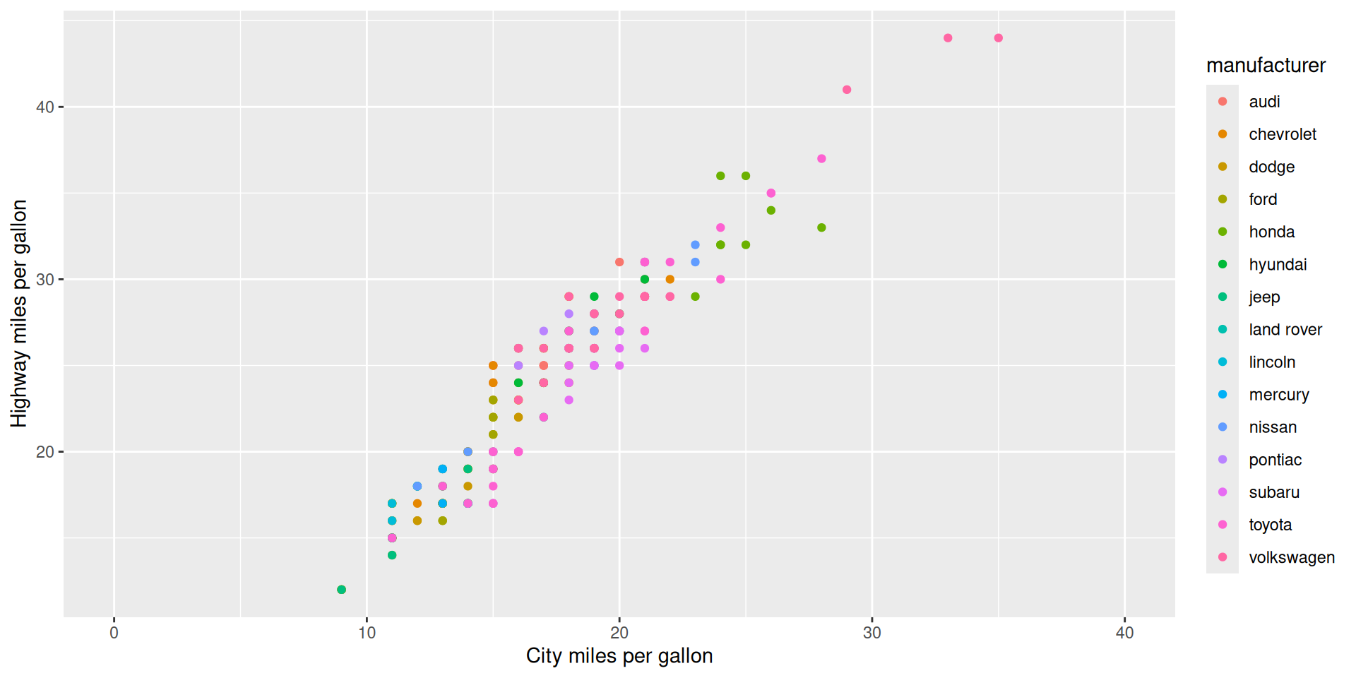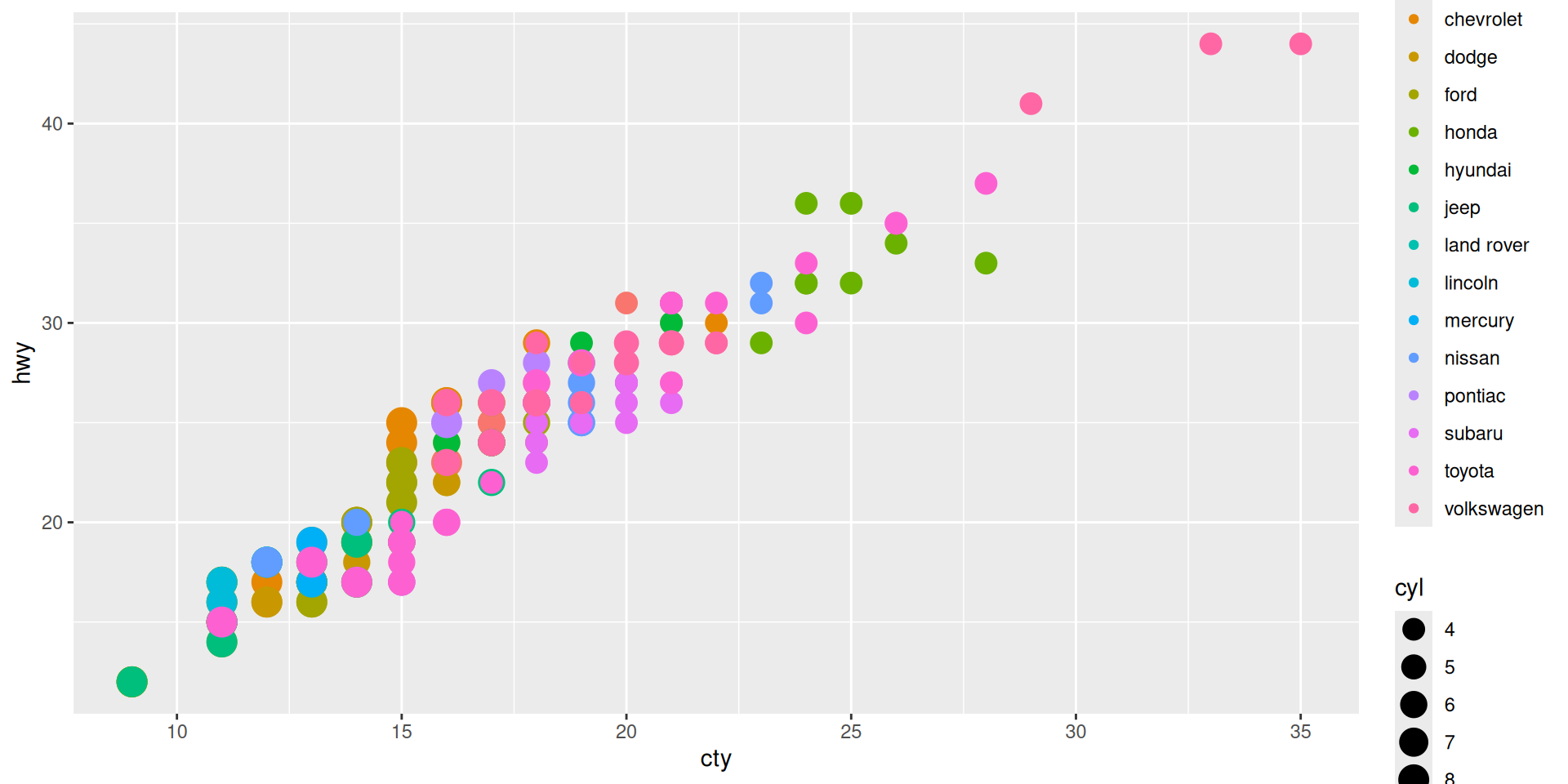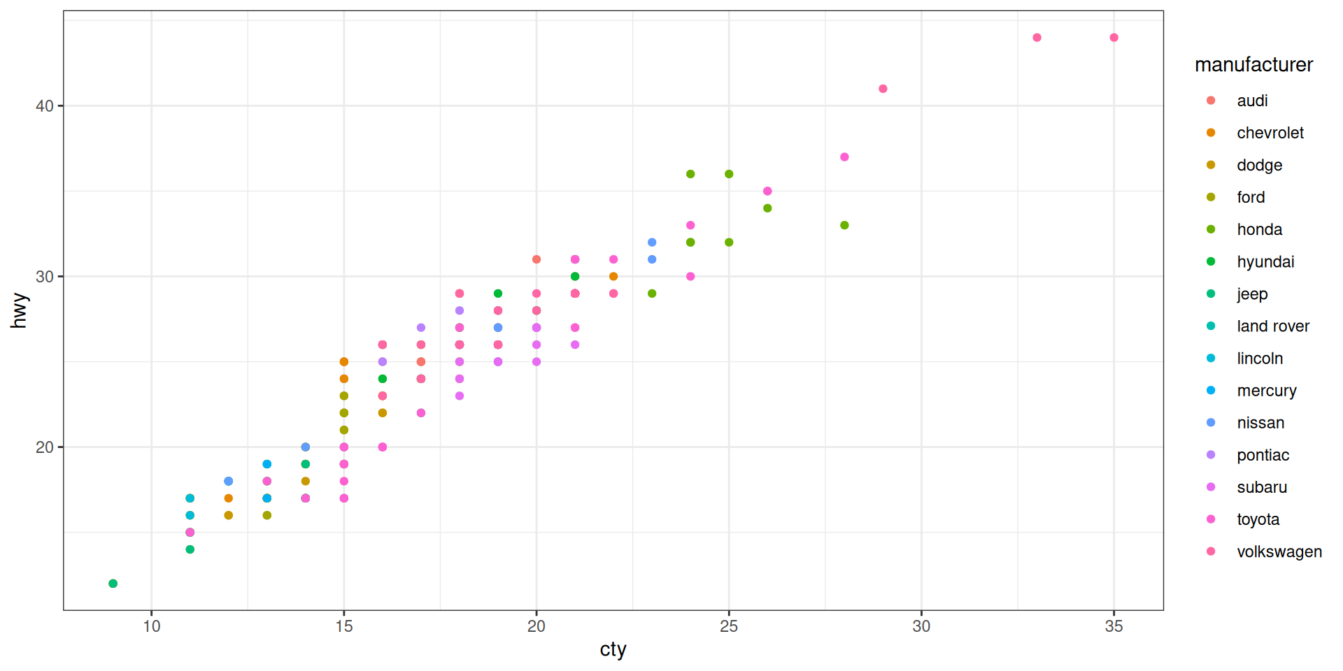ggplot(mapping = aes(x = cty, y = hwy)) + geom_point(mpg)