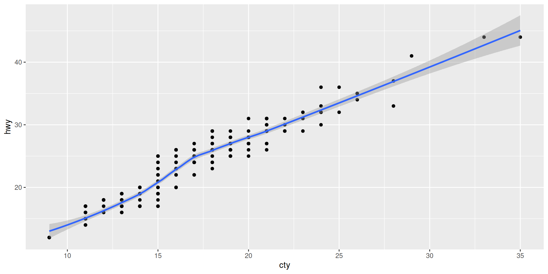 We take cty = “city miles per gallon” as x and hwy = “highway miles per gallon” as y