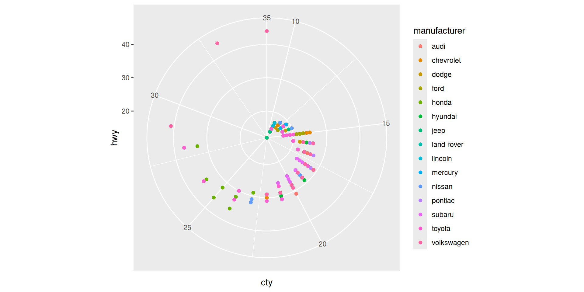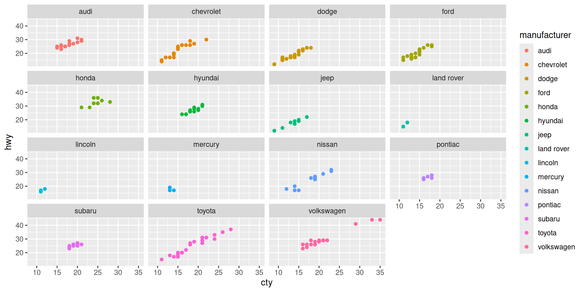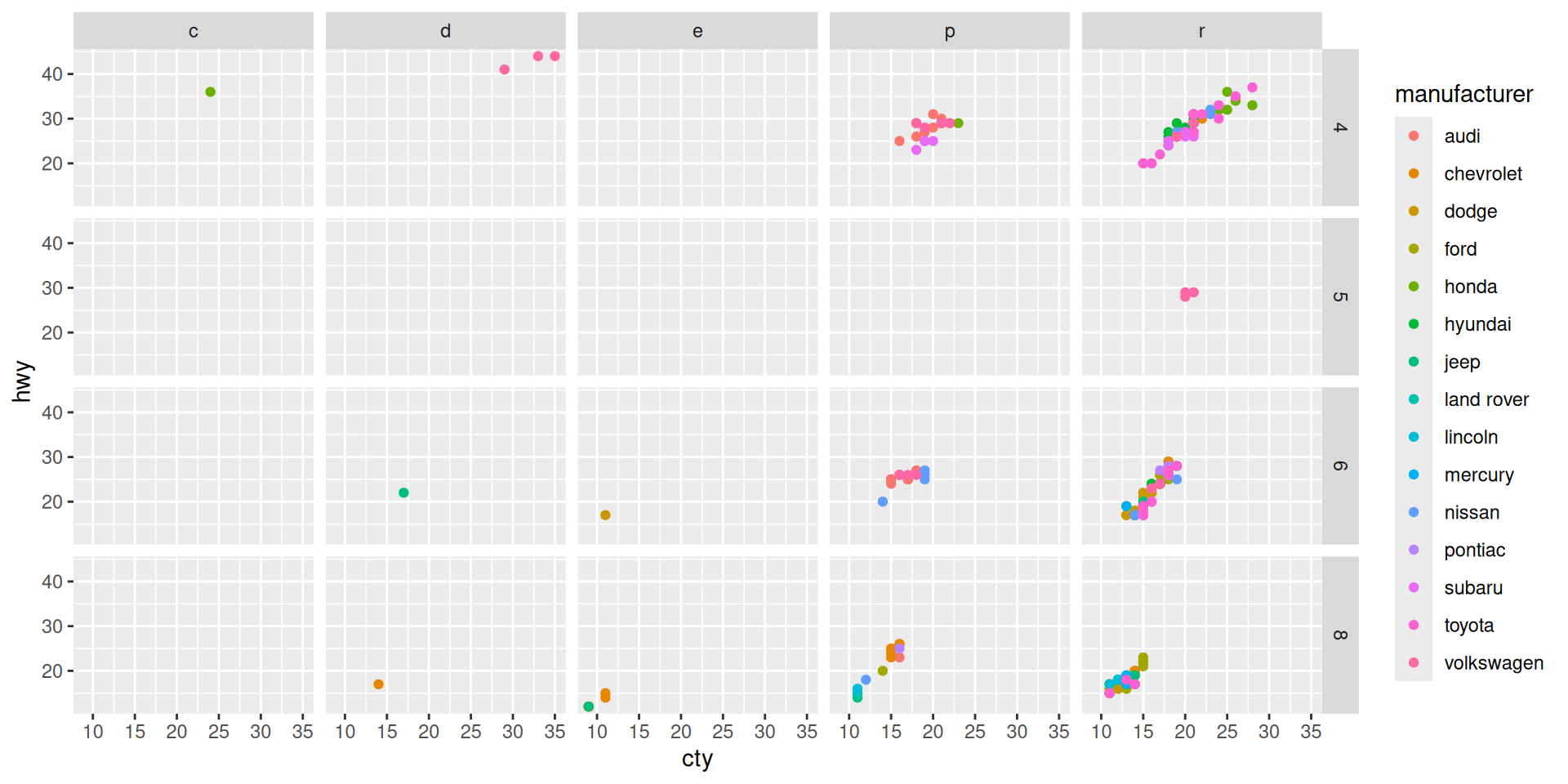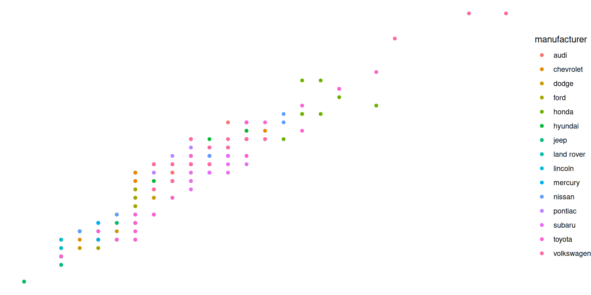 We use the mpg dataset which is in the ggplot library. Let’s take a look: