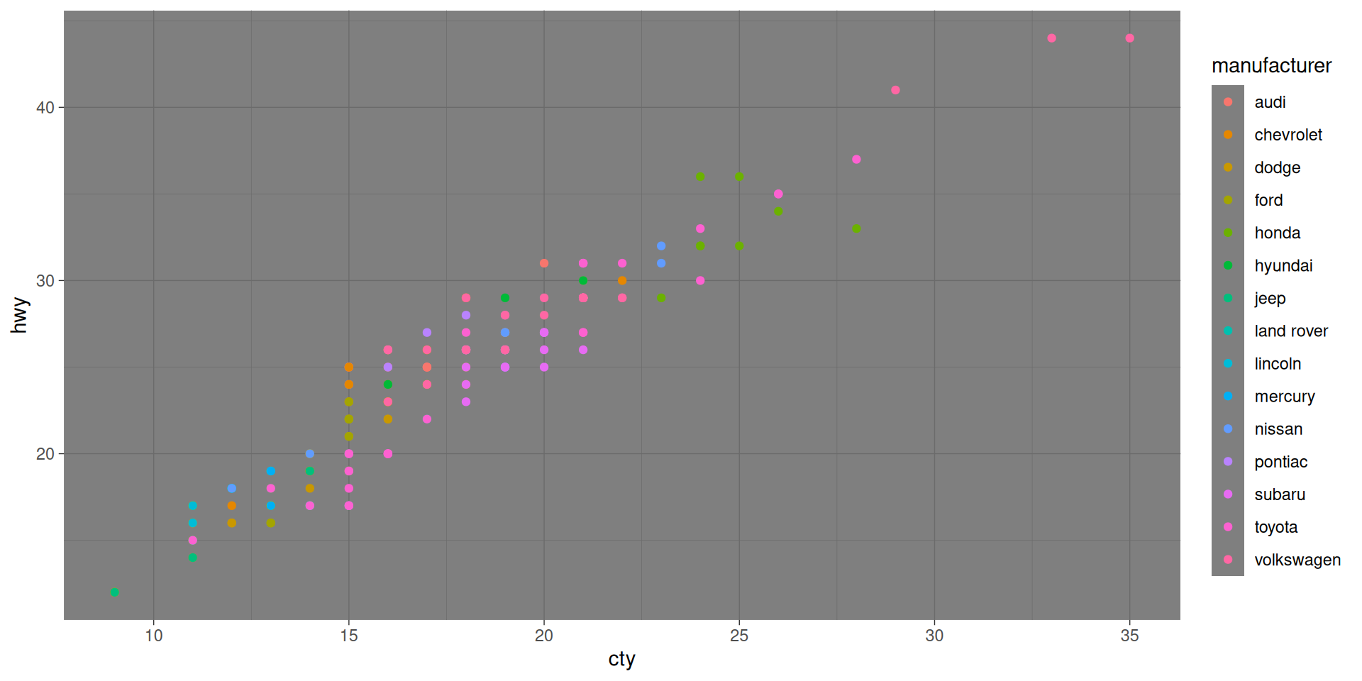 ggplot(aes(x = cty, y = hwy)) + geom_point(data = mpg)