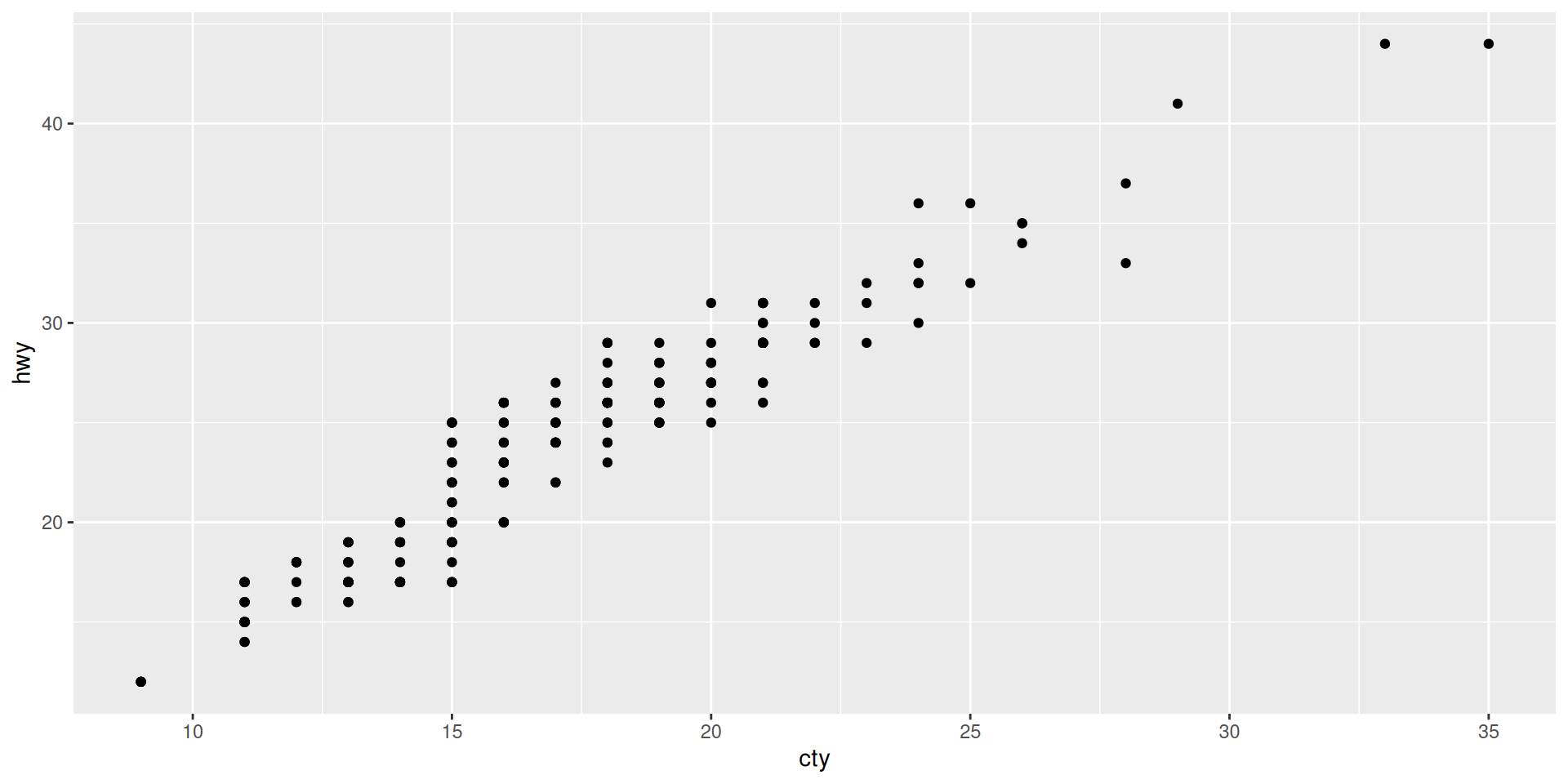ggplot(aes(x = cty, y = hwy), data = mpg) + geom_point()